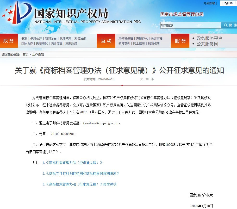 關(guān)于就《商標(biāo)檔案管理辦法(征求意見稿)》公開征求意見的通知