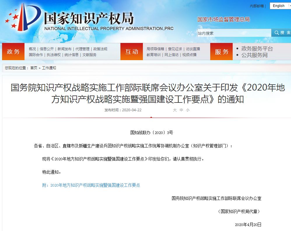 國知局昨日發(fā)布了《2020年地方知識產(chǎn)權(quán)戰(zhàn)略實(shí)施暨強(qiáng)國建設(shè)工作要點(diǎn)》