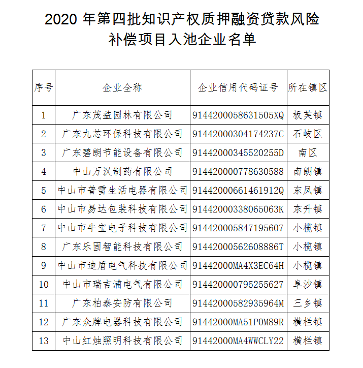 根據(jù)《中山市企業(yè)知識產(chǎn)權(quán)質(zhì)押融資貸款風險補償辦法》(中市監(jiān)〔2019〕225 號)的規(guī)定,現(xiàn)將2020年第四批入池企業(yè)名單進行公布。請試點合作銀行對入池企業(yè)做好貸款盡職調(diào)查和跟蹤服務(wù)工作,實際工作中如遇到問題,徑請向市市場監(jiān)管局知識產(chǎn)權(quán)促進科反映。