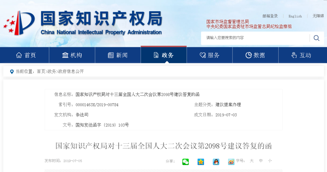 國家知識(shí)產(chǎn)權(quán)局對(duì)十三屆全國人大二次會(huì)議第2098號(hào)建議答復(fù)的函